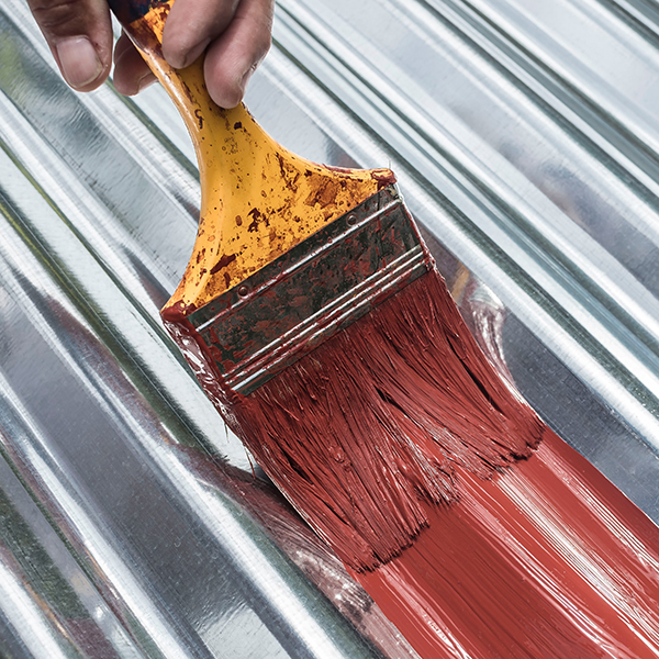 Eventuella skador på takpannor, plåtar eller infästningar åtgärdas innan målningen påbörjas.